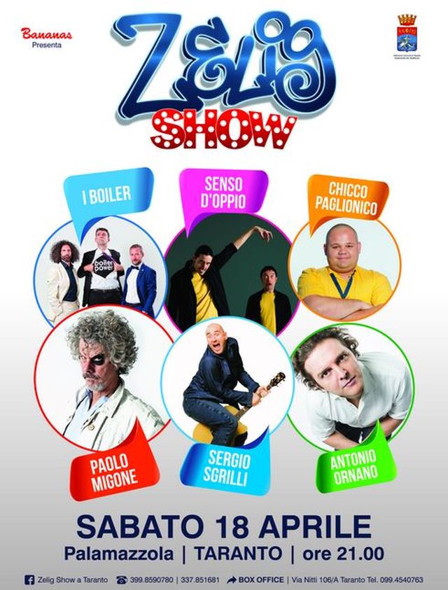 Arriva a Taranto “Zelig Show”. Per la prima volta. Dopo aver calcato i palazzetti e i teatri più importanti d’Italia, il Laboratorio comico della tv nostrana sbarca al Palamazzola per una serata – che te lo dico a fare – dalla risata assicurata.