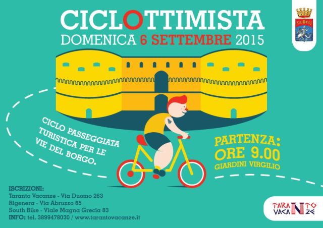 Pensateci, quanto sarebbe bello poter girare per Taranto in bicicletta. Certo, occorrerebbe un piano di riorganizzazione stradale, piste ciclabili dedicate ma soprattutto costruite con criterio (non come quella in viale Magna Grecia, per intenderci). Pensate a come sarebbe bello poter vivere la città in sella alle due ruote, abbattendo lo smog e snellendo il traffico. Utopia? Può darsi, intanto però facciamo una prova e si chiama “CiclOttimista”: una ciclo passeggiata turistica non competitiva dedicata alle famiglie, agli amatori, ai turisti e cittadini che vogliono ammirare appieno le bellezze di Taranto lasciando a casa la macchina.