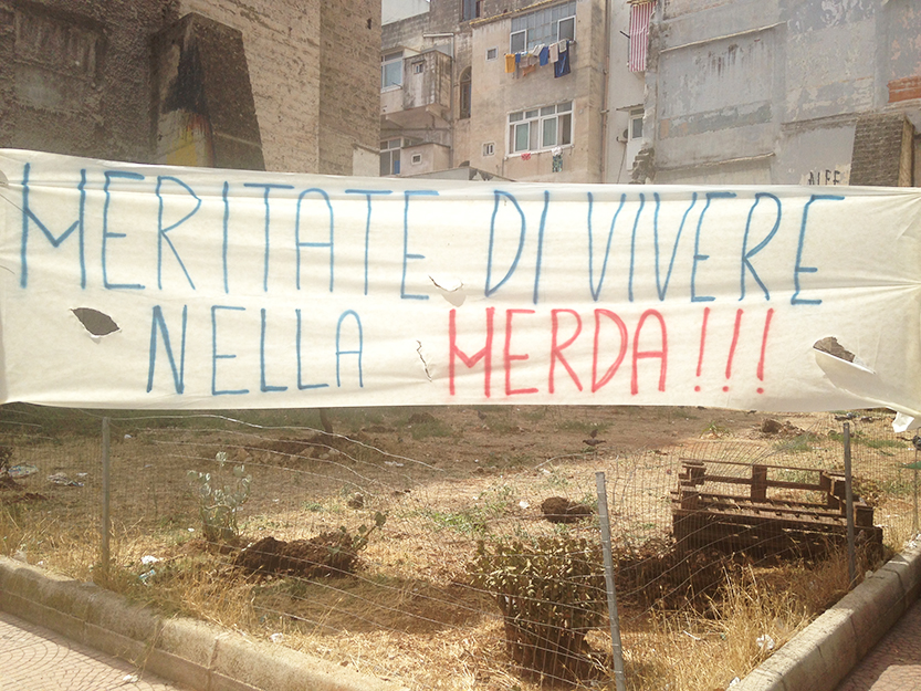 Stavo tornando a casa stamattina quando mi sono imbattuta in uno striscione emblematico: “Meritate di vivere nella merda”. Una frase sintetica ma forte, che attualmente campeggia di fronte a quell’angolo verde, tra via Duca degli Abruzzi e via Principe Amedeo, che i ragazzi di Ammazza che Piazza avevano contribuito a ripulire dal degrado.