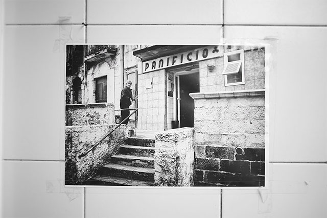 Camminando insieme a mia sorella Paola, intenta a scattare foto e a cogliere quegli attimi che non ritorneranno più, mi imbatto nel Panificio Peluso. La facciata di questo locale storico del 1700 al civico 244 di via di Mezzo è diversa da quelle in cui inciampi girando per Taranto Vecchia. Pare quasi di essere in Grecia; a dominare, non a caso, sono il bianco e il celeste. Nella serie di fotografie in bianco e nero sulle piastrelle, intravedo il celebre Marc Poll in posa in una Taranto oramai scomparsa.