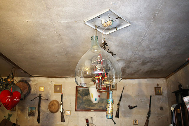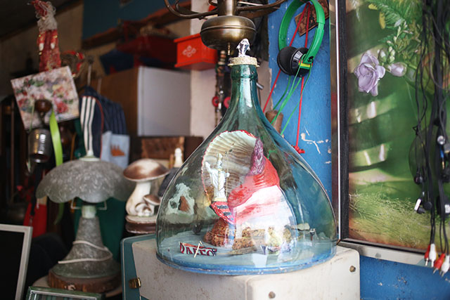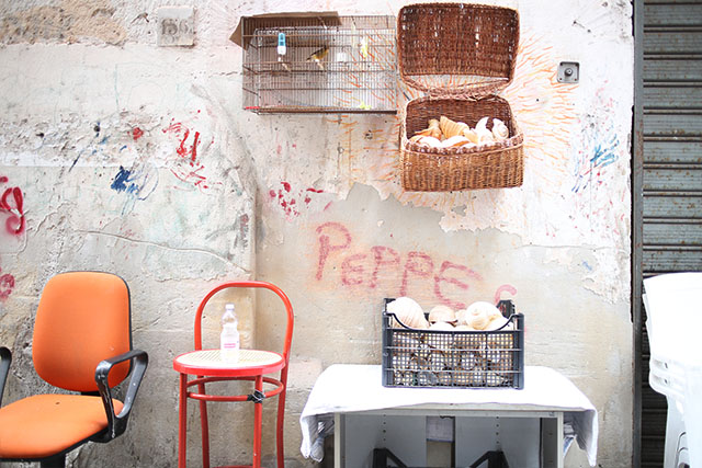 La stessa che denuncia Peppe in via Duomo, a due passi dalla Cattedrale di San Cataldo. Non appena ci vede ci osserva attentamente, nonostante pare abbia occhi solo per il suo panino con prosciutto crudo che“stuta la luce”, come si dice dalle nostre parti. Non accorgersi di lui è impossibile: a precederlo è la musica a tutto volume di Radio Taranto. E pensare che, in barba a chi crede che trascorra le sue giornate parcheggiato in mezzo alla strada sulla sua sedia arancione, Peppe in realtà ha un talento: inserire le conchiglie nelle bottiglie di vetro che vende insieme alla pila di oggetti usati con i quali ha addobbato il suo personalissimo mercatino.