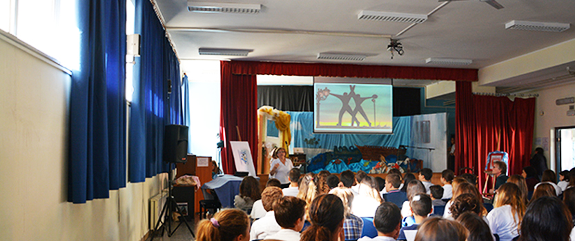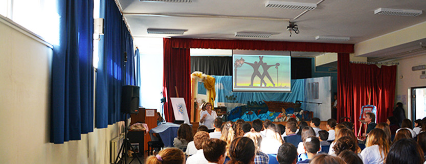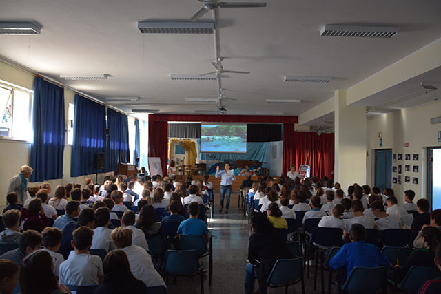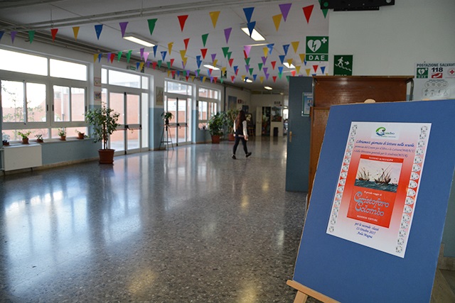 L’aula magna della Scuola media Colombo di Taranto è gremita di studenti delle seconde classi stamattina; curiosi e attenti alle parole del Dirigente scolastico, Dott. Massimo Romandini, che illustra loro la gloriosa storia e le imprese di Cristoforo Colombo.