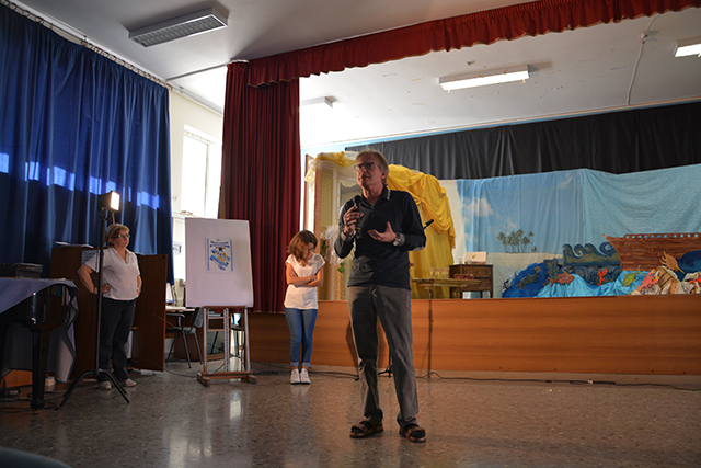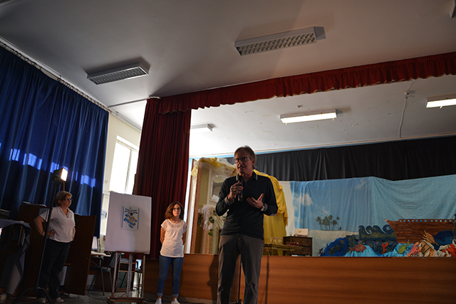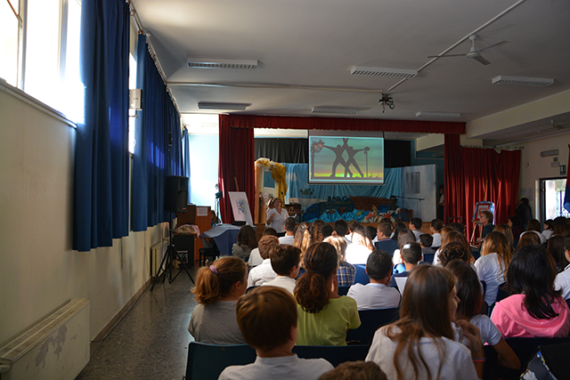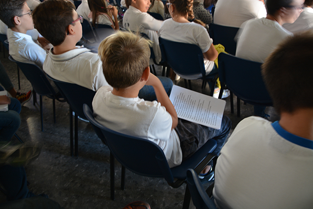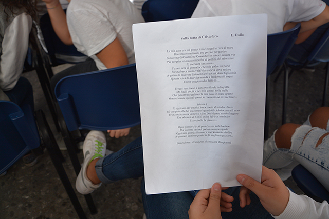 Dopo una breve introduzione del libro che Massimo Romandini ha scritto nel 1985 – Il grande viaggio di Cristoforo Colombo, Mandese Editore – focalizzandosi su uno dei personaggi di rilevanza internazionale e catalizzando l’attenzione degli studenti, le mura dell’aula “Ernesto Costa” hanno iniziato a riecheggiare sulle note di “Sulla rotta di Cristoforo Colombo” di Lucio Dalla, cantata dai bambini presenti con l’aiuto della professoressa Basile che ha seguito il coro.