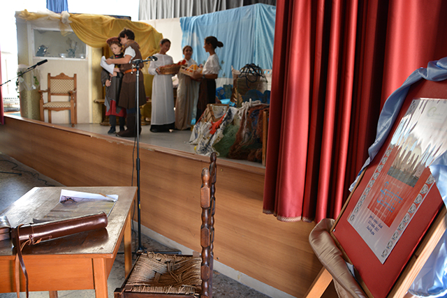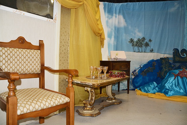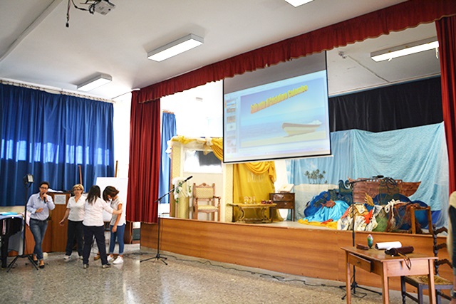 Ad abbellire l’ingresso della porta principale c’è un tavolino in legno sul quale è poggiata un’antica mappa. Sul palcoscenico, invece, campeggia una scenografia colorata e studiata ad hoc dalle professoresse Albano e Mallardi che hanno meticolosamente organizzato il lavoro. I costumi, le battute, la letture del diario di bordo, delle poesie e le musiche intervallate dalle immagini dei Marinai di Taranto e di alcuni scorci suggestivi della città, fanno il resto.