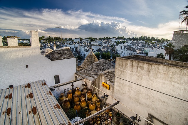 I tetti a punta, di un nero cilestrino, si staccano improvvisi da questa base contorta e armoniosa, per riempire il cielo di magiche punte. Non c’è traccia di miseria o di sporcizia. I trulli più poveri, allineati per i vicoli scoscesi, da paese montano, vaporosi e candidi, sono pieni di nitore, anche negli interni, dietro i vani neri delle porte ricoperte da tende penzolanti come reti.