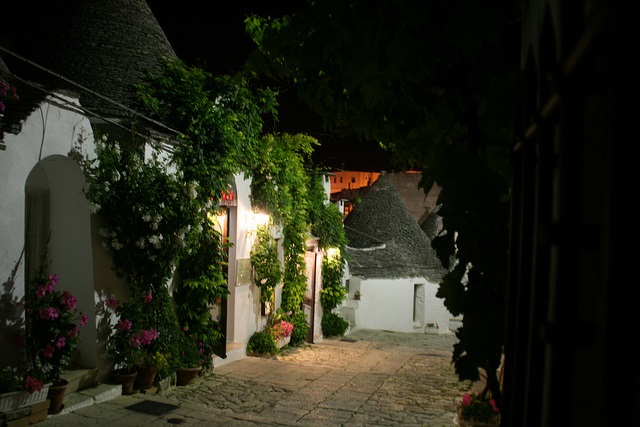 Dal primo muro all’ultimo, non un corpo estraneo, non un plagio, non una zeppa, non una stonatura. L’ammasso dei trulli nel terreno a saliscendi si profila sereno e puro, venato dalle strette strade pulitissime che fendono la sua architettura grottesca e squisita. I colori sono rigidamente il bianco – un bianco ovattato e freddo, con qualche striscia azzurrina – e il nerofumo. Ma ogni tanto nell’infrangibile ordito di questa architettura degna di una fantasia, maniaca e rigorosa – un Paolo Uccello, un Kafka – si apre una frattura dove furoreggia tranquillo il verde smeraldo e l’arancione di un orto.