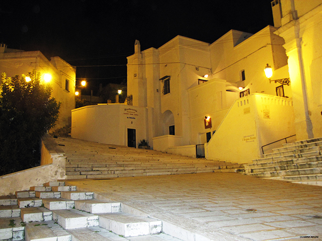 Una strada a tornanti porta dal piano all’improvvisa altura di Massafra, e conduce attraverso una stretta via (la consueta dei paesi delle Puglie) fino a una grande piazza-giardino, quadrata e festante (anch’essa la consueta, con un po’ più di magnificenza paesana).