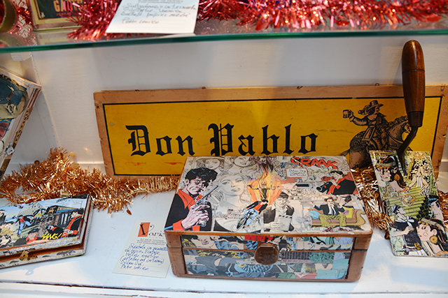 Mentre chiacchiero con Beppe, vengo rapita da un contenitore anni ’40 Biffi-Milano realizzato con una rivista del 1960. “Solo 35 euro”, penso, e già non vedo l’ora di comprare i regali di Natale lì quest’anno. Anche perché, vuoi mettere? Pezzi unici ed elaborati con prezzi che definirei davvero simbolici e alla portata di tutti ma che ti consentono di avere in casa, in ufficio o dove ti pare degli oggetti di design. Tra l’altro i materiali sono tassativamente di recupero, a parte alcune tele, per rimanere coerenti con il riappropriarsi delle cose che rappresentano il nostro passato, che però si rinnova con la creatività.