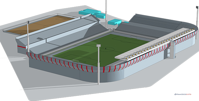Il progetto di Francesco prevede maggiore efficienza dello Iacovone dal punto di vista prestazionale e in linea con la moderna concezione di Stadio. Per fare questo le basi del lavoro sono: riconsolidamento di tutto il primo anello, realizzazione della copertura per tutti i settori, riprogettazione dell’intero sistema di rivestimento esterno dei prospetti, ridistribuzione delle aree tecniche e degli ambienti di servizio interni e realizzazione del nuovo Training Centre in prossimità del Campo B.