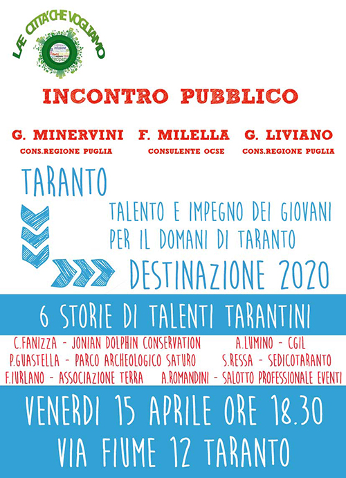 L’incontro è pubblico e presenzieranno G. Minervini, Consigliere regionale Puglia, F. Milella, Consulente Ocse e Gianni Liviano, Consigliere regione Puglia.