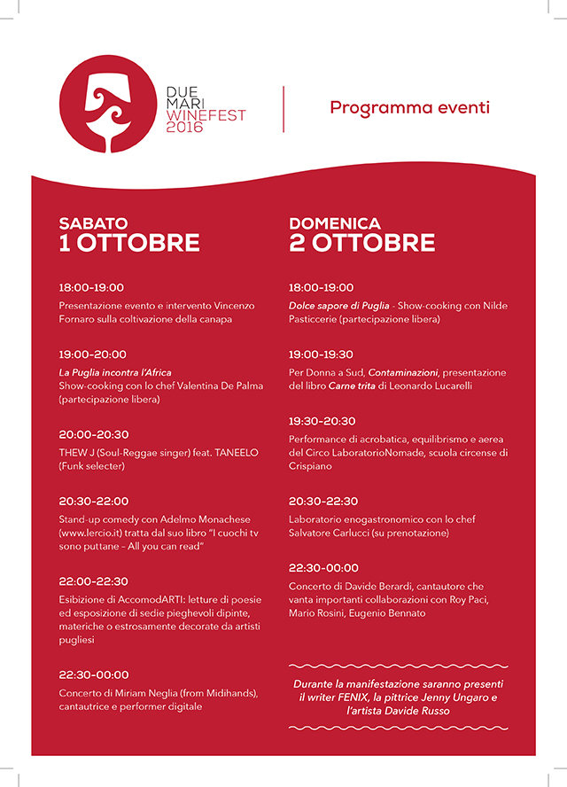 Non solo vino… al Due Mari WineFest parteciperà pure un numero esiguo di artigiani: LaNodo, Sweet Dreams, Abbigliamento Tecnico Taranto, Arc Domus che si occuperà dell’allestimento dell’area dedicata alla ristorazione e agli show-cooking.