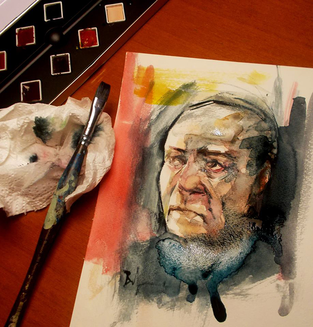 E’ a Milano che il pittore inizia a familiarizzare con i ritratti, precisamente nella Latteria di via Stendhal, disegnando sulle tovagliette di carta che ha a portata di mano. Durante il soggiorno nella città meneghina frequenta spesso la Caritas per essere a contatto con i volti dei clochard, “perché la bellezza – mi dice – è nel tratto vissuto”.