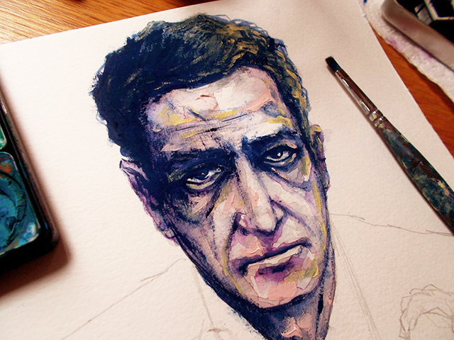 “Partiamo dal presupposto che non pulisco mai la tavolozza e che uso l’acrilico avendo un tratto istintivo. Adoro poi l’accostamento del rosso intenso al blu di Prussia che per me resta una vera e propria filosofia. E’ il simbolo dell’anima.”