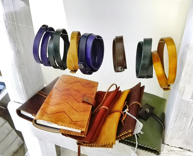 La mia attitudine “gioiellistica” (non si dice, lo so, ma a La factory tutto è possibile) mi porta verso Eu Sorrio che produce gioielli in tessuto (scarti di sartoria) e metallo (rame e ottone prevalentemente). Si tratta di pezzi unici, il che li rende ancora più interessanti. Dalla stoffa al cuoio è un attimo con Uparth, grafica con la passione per la lavorazione del cuoio.