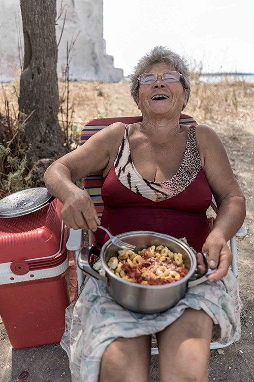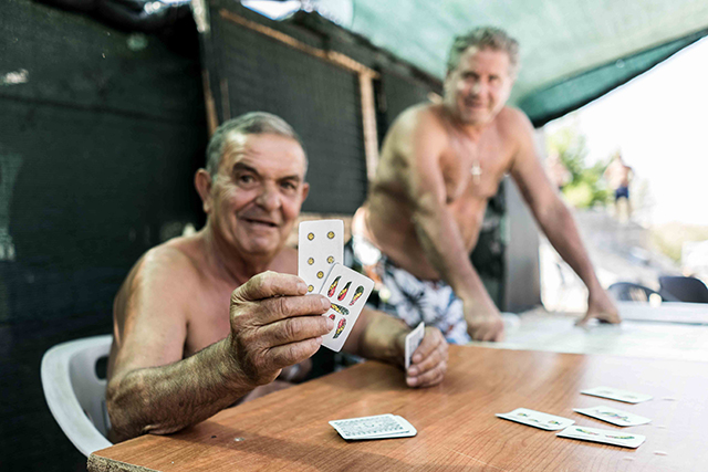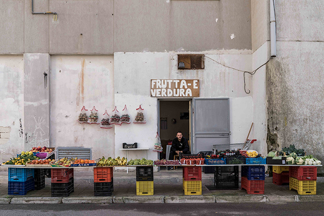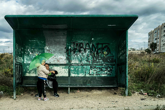 Perdiamoci nell’immensità degli spazi immortalati, inciampando in quell’umanità che trasuda dagli scatti di Greco: un binario che viene occupato dall’ulivo; facce di uomini che giocano a scopa o a patrun’e sott’; gente che ride; fatiatori che stanno in mezzo alla via; una Madonna di gesso decapitata; le note pensiline AMAT che sembrano torrette saracene verde lamiera, abbruttite dal tempo e dai cristiani della Zona (a) Macchie.