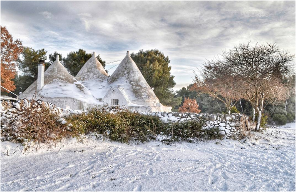 Trulli innevati, panorami spruzzati di bianco, strade ghiacciate. Da due giorni sono decine le foto che circolano sul web e che immortalano una Puglia cosparsa di neve e che incanta turisti e abitanti.