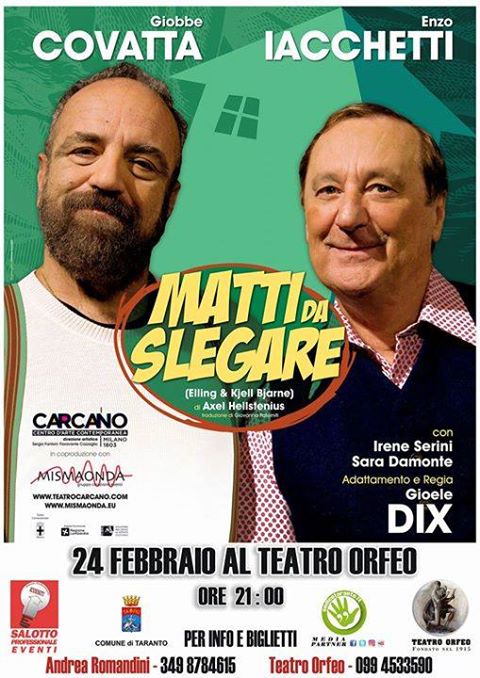 Di una cosa sono certa, le risate che Enzo Iacchetti e Giobbe Covatta ci faranno fare venerdì 24 febbraio al Teatro Orfeo di Taranto saranno matte, come loro due… due Matti da slegare!