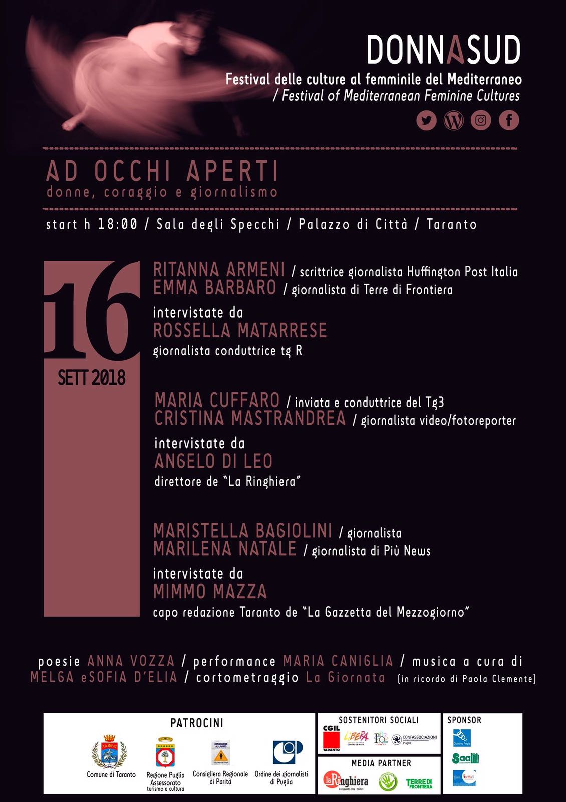 Il Festival avrà inizio DOMENICA 16 SETTEMBRE – con un convegno dal titolo “AD OCCHI APERTI: DONNE, CORAGGIO E GIORNALISMO”. Alle ore 18 presso il Salone degli Specchi, a Palazzo di Città, prenderà avvio l’incontro a cui parteciperanno i grandi nomi del giornalismo italiano: Ritanna Armeni giornalista di Huffington Post, autrice di “Una donna può tutto. 1941: volano le Streghe della notte”; Maria Cuffaro inviata e conduttrice del Tg3 e autrice del libro “Kajal. Le vite degli altri e la mia”; Cristina Mastrandrea fotoreporter, giornalista e videomaker; Marilena Natale collaboratrice dell’emittente televisiva locale ‘Più N News’ giornalista anticamorra sotto scorta; Maristella Bagiolini giornalista free lance per testate giornalistiche nazionali e locali; Emma Barbaro Giornalista, caporedattrice del periodico Terre di frontiera.