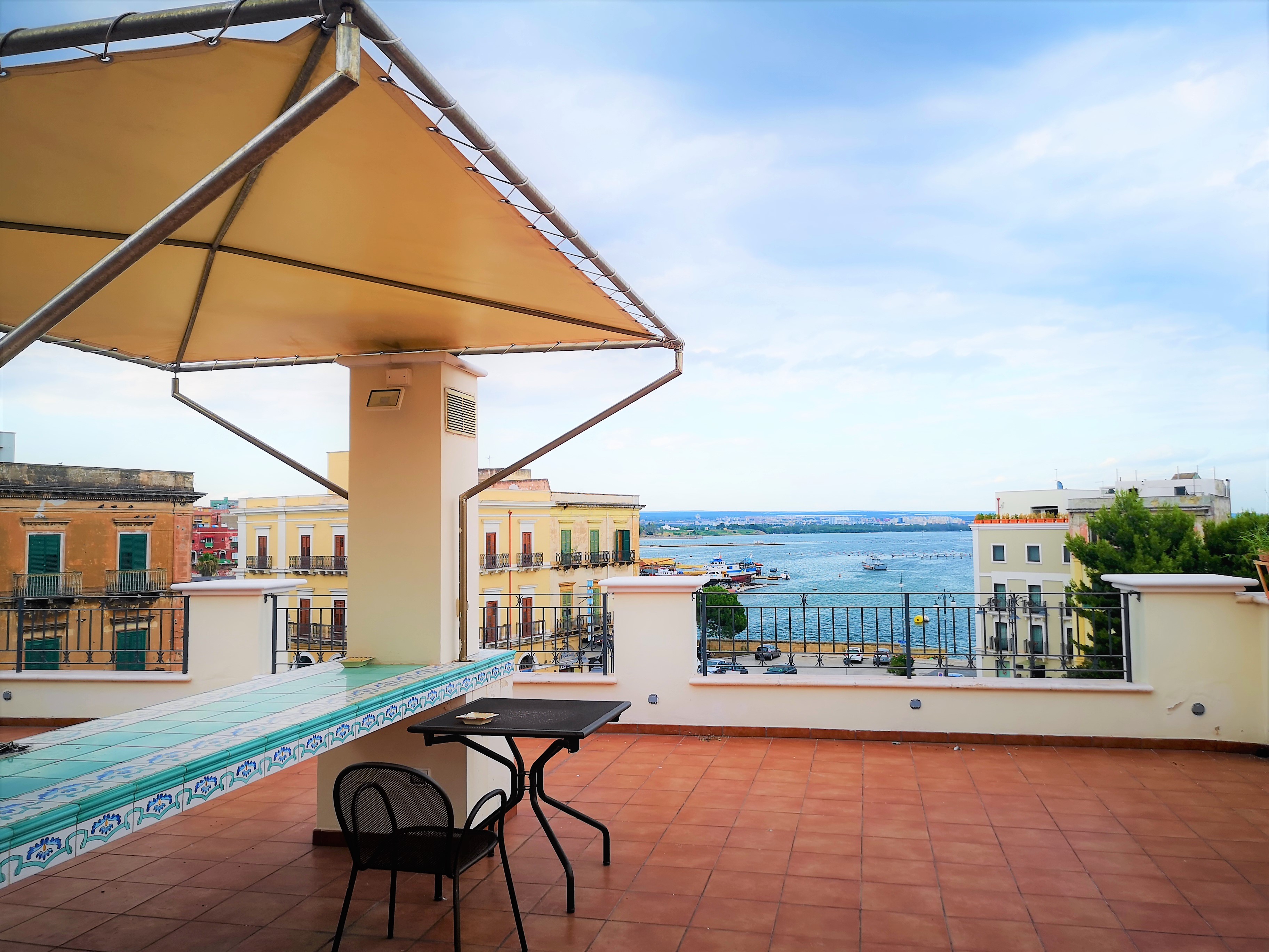Immagina una terrazza sul mare, precisamente sul Mar Piccolo, i tetti rossastri della città vecchia baciati dai tramonti tarantini, quei tramonti dal fascino inconfondibile e un panorama che ti disarma. Immagina, poi, di degustare – di fronte a tutta questa bellezza – un calice di vino di alcune delle migliori aziende vitivinicole del territorio pugliese.